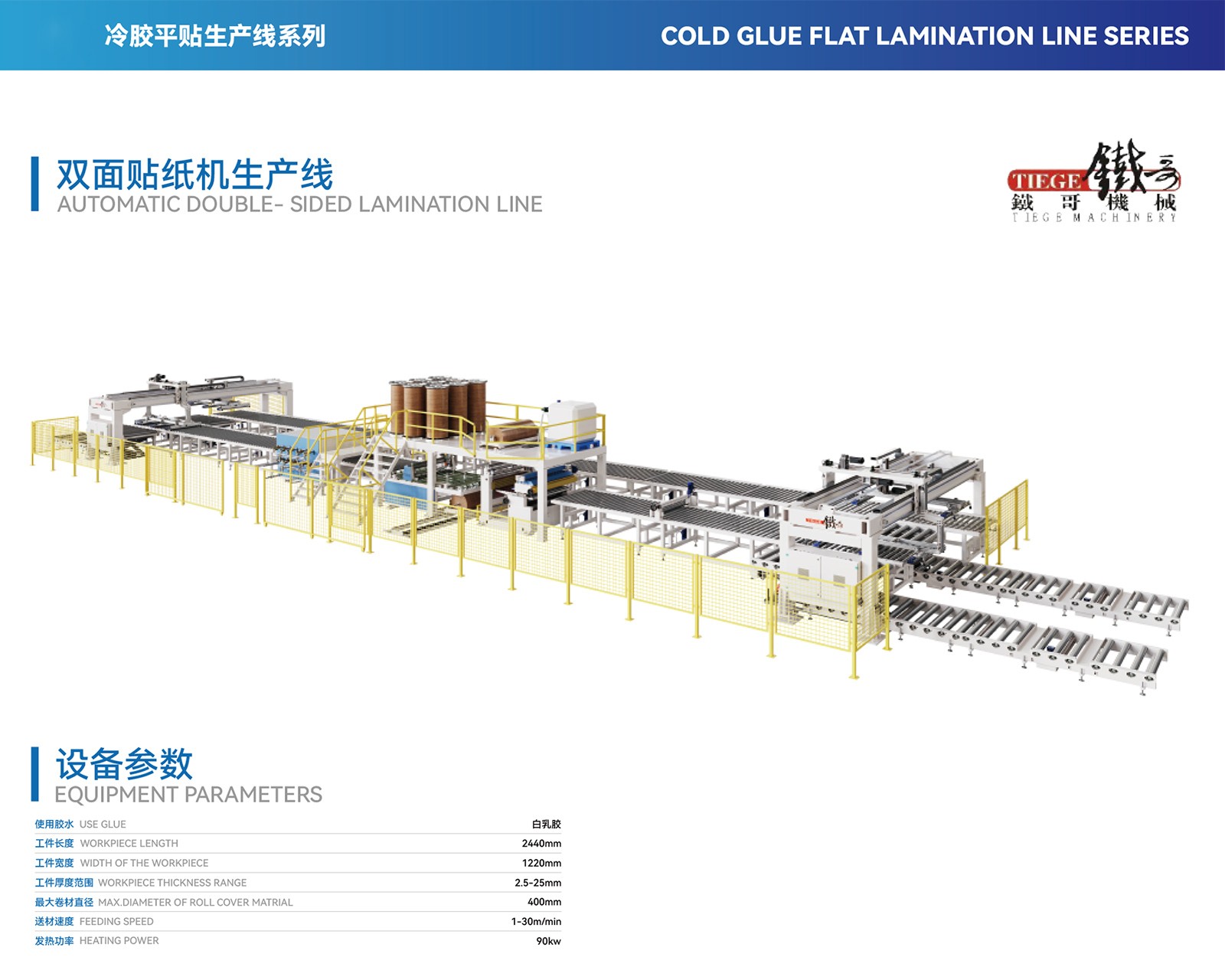 简便,性能稳定等优点;加工后的板材表面不起皱,不起泡,产品合格率。除了单面贴纸,此生产线还可设计同时双面贴纸,达到高速产